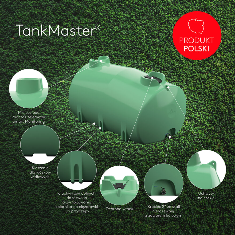 The tank is characterized by a solid, single-plane construction made of polyethylene stabilized by UV light. Kingspan simultaneously launched three product variants enabling the storage of liquid fertilizers (green), domestic water (black) and AdBlue® (white). The uniqueness of TankMaster® is primarily its unique structure designed to ensure maximum strength and stiffness, which means increased resistance to weather conditions and mechanical damage allows you to enjoy the tank for many years. Purchasing a TankMaster® tank is an investment for years.